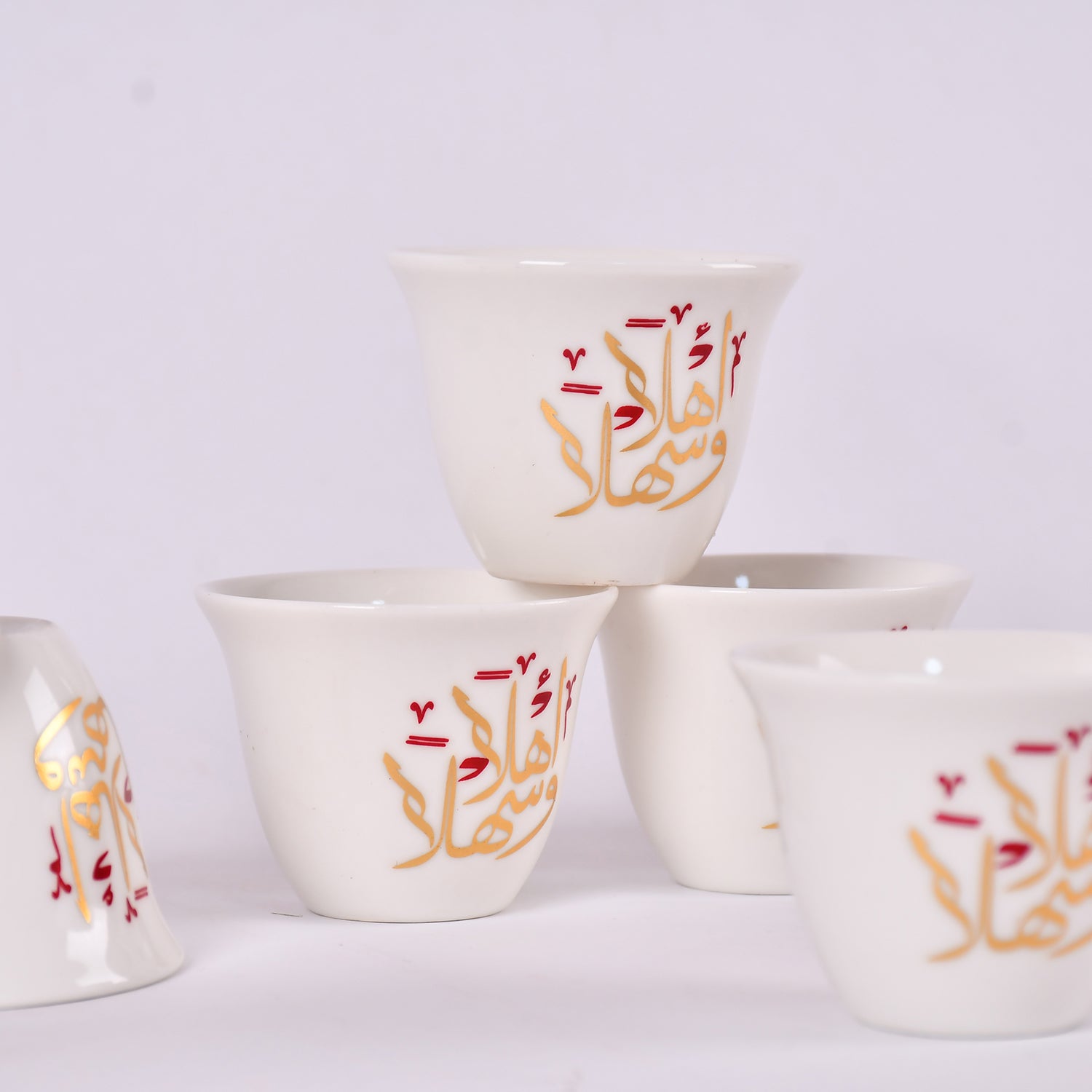 أكواب القهوة العربية بكتابة "أهلا و سهلا" تجمع بين الأصالة والفخامة. مصنوعة بجودة عالية، تتميز بتصميم تقليدي يعكس الضيافة العربية الأصيلة. متوفرة في مجموعات عملية: 6 أكواب للاستخدام اليومي أو 12 كوب للمناسبات والتجمعات العائلية الكبيرة. الخيار المثالي لمحبي القهوة العربية الذين يقدرون الأناقة والتراث.