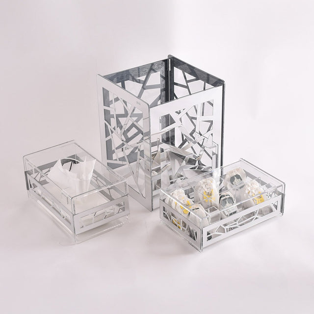 Give your space a clean, luxurious hotel look with this full silver-acrylic set. All 3 pieces come in the same modern design, so your console, coffee corner, or living room looks organized and premium.